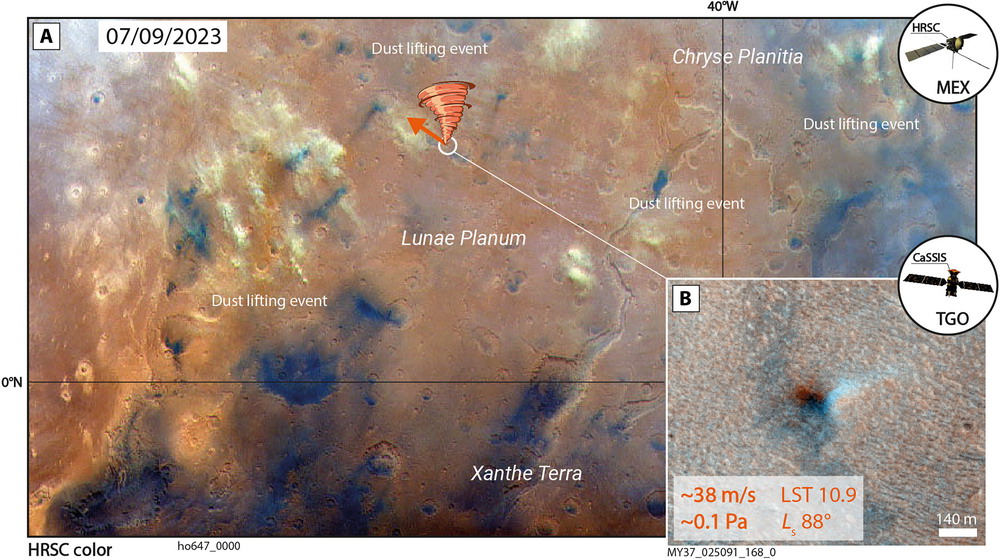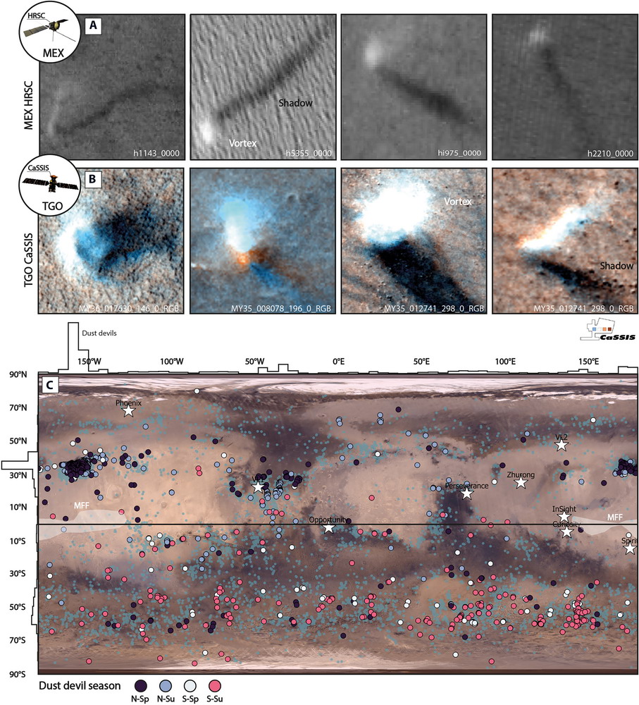 10 de octubre de 2025, un nuevo estudio revela que pequeños tornados de polvo se arremolinan sobre las llanuras oxidadas de Marte a una velocidad mucho mayor de la que los científicos creían. Investigadores rastrearon 1039 remolinos de polvo en el planeta rojo, captados en dos décadas de imágenes de los orbitadores de la Agencia Espacial Europea (ESA). Los hallazgos, publicados el miércoles 8 de octubre en la revista Science Advances, muestran que estos tornados pueden alcanzar velocidades de hasta 158 km/h, superando con creces las mediciones previas de los exploradores marcianos y los modelos climáticos. Los resultados podrían ayudar a los científicos a planificar futuras misiones a Marte, al tener en cuenta el polvo problemático que recubre los paneles solares del rover y se desplaza por los sitios de aterrizaje durante el descenso, afirman los investigadores. Un mapa de Marte muestra 1000 remolinos de polvo, representados por puntos rosas, blancos, azules o negros. Un mapa muestra 1039 remolinos de polvo detectados en Marte utilizando 20 años de datos de las sondas Mars Express de la ESA y el Orbitador de Gases Traza ExoMars. "Nuestras mediciones podrían ayudar a los científicos a comprender mejor las condiciones del viento en el lugar de aterrizaje antes del aterrizaje, lo que podría ayudarles a estimar la cantidad de polvo que podría depositarse en los paneles solares de un rover y, por lo tanto, la frecuencia con la que deberían autolimpiarse", declaró Valentín Bickel, líder del equipo de estudio de la Universidad de Berna (Suiza). Para crear el catálogo, el equipo de Bickel utilizó inteligencia artificial para examinar cuidadosamente los archivos de las sondas Mars Express de la ESA y el Orbitador de Gases Traza (TGO) de ExoMars, analizando cómo se desplazaba cada remolino de polvo entre fotogramas consecutivos para calcular su velocidad y dirección. "Los remolinos de polvo hacen visible el viento, normalmente invisible", explicó Bickel en el comunicado. "Al medir su velocidad y dirección de desplazamiento, hemos comenzado a cartografiar el viento en toda la superficie de Marte". "Esto era imposible antes, porque no teníamos suficientes datos para realizar este tipo de medición a escala global", añadió. Ninguna de las naves espaciales fue diseñada para medir el viento, pero los investigadores aprovecharon una sutil peculiaridad en las cámaras de los orbitadores para hacerlo. Cuando las sondas combinan múltiples vistas o colores para crear una sola imagen, a veces aparecen pequeñas diferencias de color, causadas por retrasos de segundos entre los canales de la cámara, que normalmente se descartan como ruido de imagen. Dado que cada canal se captura con unos segundos de diferencia, cualquier movimiento en Marte, como nubes o remolinos de polvo, deja una ligera pero medible diferencia entre fotogramas. Al analizar estos cambios, el equipo determinó la distancia y la velocidad de cada remolino. De esta manera, el equipo "convirtió el ruido de la imagen en valiosas mediciones científicas", afirmó Bickel.El equipo rastreó unos 300 eventos en pares estéreo para calcular el movimiento y la velocidad. «Las imágenes estereoscópicas son imágenes del mismo punto en la superficie de Marte, pero tomadas con unos segundos de diferencia. Por lo tanto, estas imágenes pueden utilizarse para medir el movimiento de los remolinos de polvo». El nuevo catálogo también muestra que estos remolinos marcianos suelen ser arrastrados desde las llanuras polvorientas del planeta, como Amazonis Planitia, señala el nuevo estudio. Aparecen con mayor frecuencia durante el día en primavera y verano, duran solo unos minutos y alcanzan su punto máximo entre el final de la mañana y el comienzo de la tarde, marcando un ritmo familiar para los científicos que estudian los remolinos de polvo en la Tierra. "Ahora que sabemos dónde suelen formarse los remolinos de polvo, podemos dirigir más imágenes a esos lugares y momentos exactos", declaró Bickel. Sin embargo, a diferencia de la Tierra, donde la lluvia arrastra el polvo del aire, el polvo marciano puede permanecer allí durante meses. Comprender cómo y cuándo se levanta de la superficie es clave para predecir el tiempo y el clima a largo plazo del planeta. Los nuevos datos, recopilados en Marte de una forma que los rovers y los módulos de aterrizaje no podrían lograr por sí solos, podrían ayudar a refinar los modelos atmosféricos y mejorar las previsiones meteorológicas futuras, según el comunicado.
