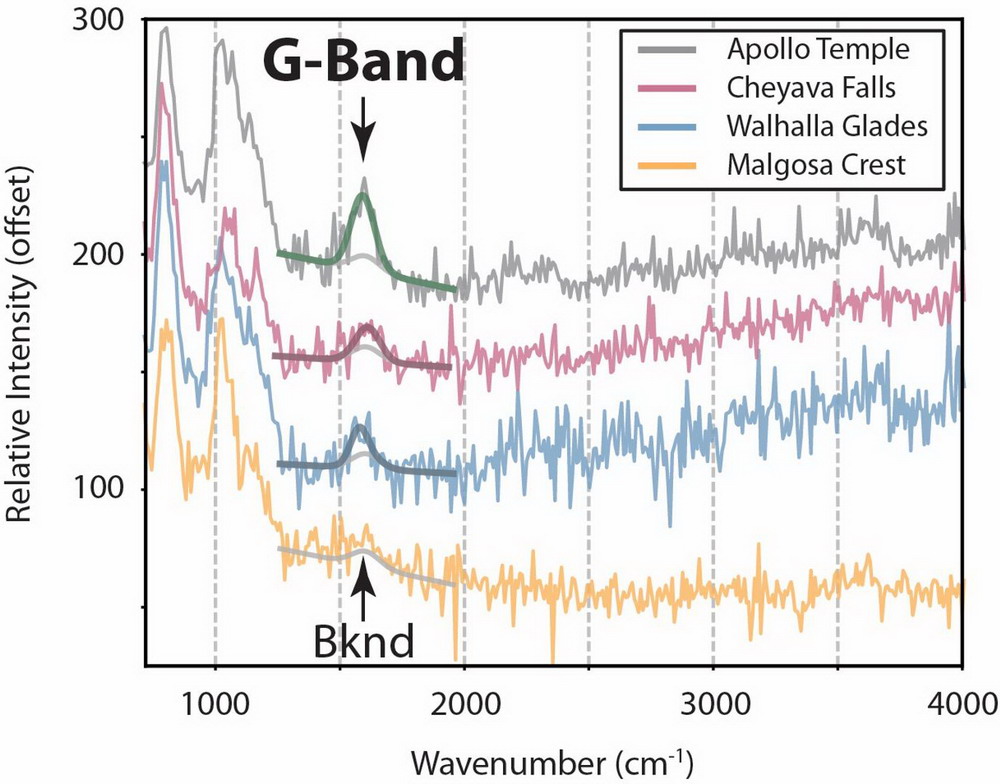 1 de octubre de 2025, Perseverance logró algo inusual: erosionar dos rocas radicalmente diferentes en tan solo unos días. Mientras exploraba la zona de Vernodden, a lo largo del borde del cráter Jezero, el rover ha estado estudiando lo que podrían ser "megabloques", una variedad de materiales antiguos de la corteza con pistas sobre la historia geológica temprana de Marte. El objetivo "Peachflya", erosionado en el sol 1618, reveló clastos de diferente composición mineral. Esto podría indicar que la roca es una brecha formada a partir de fragmentos de materiales aún más antiguos que se fragmentaron, transportaron y cementaron, posiblemente durante un impacto en el pasado remoto de Marte. Imagen de la mancha de abrasión "Klorne", tomada por la cámara Watson de Perseverance en el sol 1623. A pocos metros de distancia, el objetivo "Klorne" sufrió una abrasión en el sol 1623, lo que revela una historia completamente diferente. La superficie reciente es verdosa, con algunas manchas oscuras y vetas blancas, evidencia de una alteración química significativa. El tono verde de Klorne es consistente con el mineral serpentina y recuerda a la abrasión que Perseverance realizó en el lago Serpentine en el sol 1404. A continuación, Perseverance examinará el megabloque "Monacofjellet", que muestra otra firma espectral distintiva. Cada uno de estos antiguos fragmentos puede ayudar al equipo científico a reconstruir los complejos procesos geológicos que moldearon el Marte primitivo hace miles de millones de años. El rover Perseverance generó este mapa mineral que muestra la presencia de dos minerales: vivianita (morada y rosa) y greigita (amarillo opaco y verde) en la superficie de una roca apodada "Cascadas Cheyava". Los datos ayudaron a los científicos a determinar que la roca contenía una posible biofirma, es decir, una sustancia o estructura que podría tener origen biológico, pero que requiere más datos o estudios adicionales antes de poder concluir sobre la ausencia o presencia de vida. Los instrumentos PIXL (Instrumento Planetario para Litoquímica de Rayos X) y SHERLOC (Escaneo de Entornos Habitables con Raman y Luminiscencia para Orgánicos y Químicos) de Perseverance detectaron un patrón distintivo de minerales dispuestos en frentes de reacción (puntos de contacto donde ocurren reacciones químicas y físicas) que el equipo denominó "manchas de leopardo". Las manchas de leopardo presentaban la firma de vivianita (fosfato de hierro hidratado) y greigita (sulfuro de hierro). La vivianita aparece en las manchas negras que los científicos de la misión denominan "semillas de amapola" y en los bordes oscuros de las "manchas de leopardo" más grandes. La greigita se observa en el interior de las manchas de leopardo, que podrían haber sido dejadas por la vida microbiana si esta hubiera utilizado las materias primas (carbono orgánico, azufre y fósforo) de la roca como fuente de energía. La vivianita se encuentra frecuentemente en la Tierra en sedimentos y turberas, así como alrededor de materia orgánica en descomposición. De igual manera, ciertas formas de vida microbiana en la Tierra pueden producir greigita. La combinación de estos minerales, que parecen haberse formado mediante reacciones de transferencia de electrones entre el sedimento y la materia orgánica, es una posible "huella digital" de la vida microbiana, que utilizaría estas reacciones para producir energía para su crecimiento. Los minerales también pueden generarse abióticamente, es decir, sin la presencia de vida. Este gráfico muestra datos recopilados por el rover Perseverance de la NASA en Marte, provenientes de objetivos en una formación rocosa apodada "Bright Angel". Posteriormente, los científicos determinaron que uno de esos objetivos, una roca apodada "Cheyava Falls" (segunda línea desde arriba), contenía una posible biofirma. Una posible biofirma es una sustancia o estructura que podría tener un origen biológico, pero que requiere más datos o estudios adicionales antes de poder concluir sobre la ausencia o presencia de vida. El gráfico incluye "bandas G", un tipo de señal en la espectroscopia Raman, que indica la presencia de moléculas orgánicas, que pueden provenir tanto de fuentes geológicas como biológicas. ("Bknd" es la abreviatura de "fondo"). Los datos fueron recopilados por un instrumento ubicado en el extremo del brazo robótico de Perseverance llamado SHERLOC (Escaneo de Entornos Habitables con Raman y Luminiscencia para Orgánicos y Químicos).