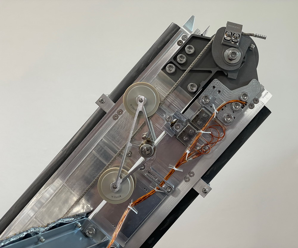 4 de diciembre de 2025, desplegar las rampas que guiarán al rover Rosalind Franklin de ExoMars 2028 sobre la superficie marciana requiere algunos trucos de ingeniería. Esta imagen de cerca de la bisagra muestra una parte del mecanismo que abrirá las rampas en el planeta rojo. El módulo de aterrizaje de Rosalind cuenta con dos juegos de rampas que el rover utilizará para descender y comenzar a explorar el terreno, antaño rico en agua, de Oxia Planum en busca de señales de vida. Las rampas de tres metros de largo recorrerán millones de kilómetros plegadas entre la Tierra y Marte. Al aterrizar, un solo perno activará la secuencia de despliegue. Esta liberación será uno de los momentos más estresantes de la misión tras el aterrizaje en Marte en 2030. Esta bisagra permitirá un despliegue automatizado y sincronizado de las rampas. Los dos rodillos conectados en el centro de la imagen garantizarán una liberación suave. Los cables naranjas del sensor, enhebrados debajo, ayudarán a confirmar el despliegue, mientras que los dos tubos negros de fibra de carbono a los lados actuarán como rieles de guía para evitar que el rover se caiga de las rampas. Las rampas de aluminio tienen un patrón fresado para mejorar el agarre con las seis ruedas del rover. Para el mecanismo de liberación se han tenido en cuenta las vibraciones del cohete, los vientos marcianos y los flujos de calor solar. La operación completa durará un máximo de cinco minutos en Marte.