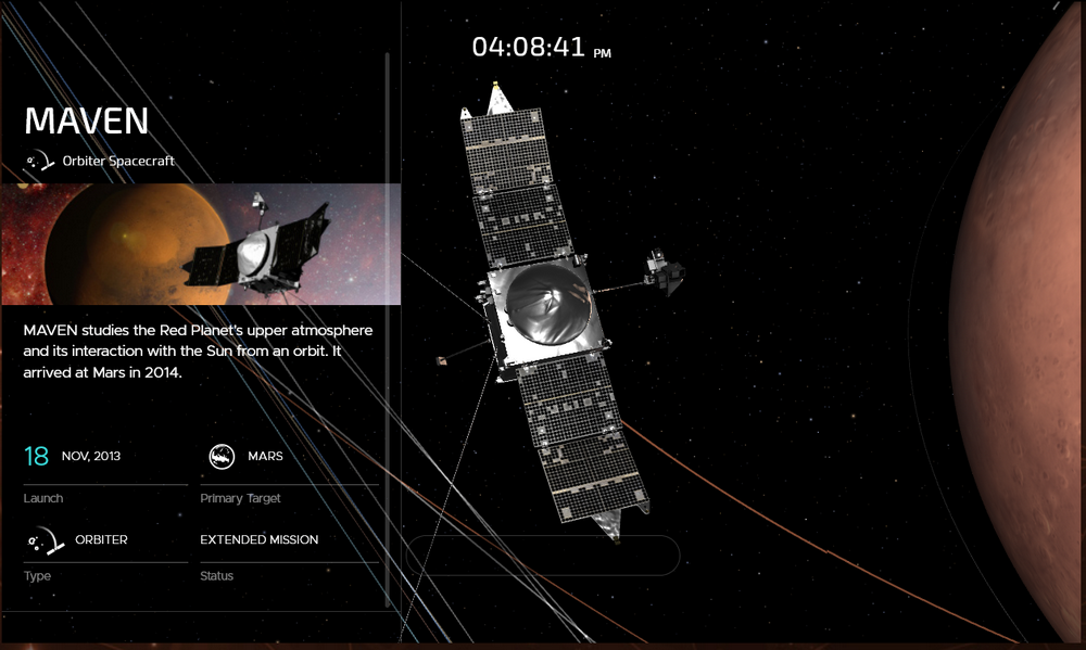 Erosión atmosférica extrema: uno de los primeros grandes descubrimientos de MAVEN fue cómo el viento solar (una corriente de partículas cargadas que fluye continuamente desde el Sol) y las tormentas solares desgastan continuamente la atmósfera de Marte, que desempeñó un papel clave en la alteración de la habitabilidad del planeta. Un nuevo tipo de aurora: MAVEN ha descubierto varios tipos de auroras que se encienden cuando partículas energéticas se sumergen en la atmósfera, bombardeando gases y haciéndolos brillar. MAVEN demostró que los protones, en lugar de los electrones, crean auroras en Marte. Tormenta de polvo marciana: en 2018, MAVEN estudió el impacto de una tormenta de polvo a nivel planetario en la atmósfera superior de Marte, y descubrió que tales tormentas elevan las moléculas de agua a una altura mayor de lo habitual, lo que provoca un aumento repentino de la pérdida de agua hacia el espacio. Mapeo de corrientes eléctricas y colas retorcidas: MAVEN mapeó campos eléctricos y magnéticos por primera vez, revelando un sistema de corriente complejo y una cola magnética retorcida que juegan un papel fundamental en la pérdida atmosférica de Marte. MAVEN observó recientemente la inesperada “desaparición” del viento solar. Esto fue causado por un tipo de evento solar tan poderoso que creó un vacío a su paso a través del sistema solar. Las mediciones de MAVEN mostraron que cuando llegó a Marte, la densidad del viento solar se redujo significativamente. Esta desaparición del viento solar permitió que la atmósfera y la magnetosfera marcianas se expandieran miles de kilómetros.