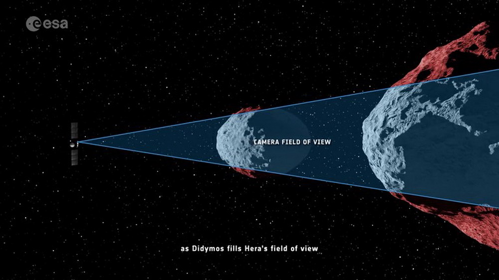 14 de octubre de 2024, tras un lanzamiento exitoso el 7 de octubre de 2024, los instrumentos de Hera se activaron por primera vez como parte de la fase de puesta en servicio de la nave espacial en curso. El jueves 10 de octubre y el viernes 11 de octubre, la cubierta de asteroides de Hera, que alberga los instrumentos de la nave espacial, se dirigió hacia nuestro planeta y tres de sus instrumentos capturaron sus primeras imágenes de la Tierra y la Luna desde una distancia de más de un millón de kilómetros. La Cámara de encuadre de asteroides (AFC) de Hera capturó esta imagen de despedida de la Tierra (abajo a la izquierda) y la Luna (centro) el 11 de octubre desde una distancia de aproximadamente 1,6 millones de kilómetros. La Tierra está orientada con el norte apuntando hacia arriba, con el Océano Pacífico iluminado por el Sol. Con dos cámaras protegidas por deflectores para redundancia, cada una de las dos Cámaras de encuadre de asteroides de Hera es un sensor de luz visible monocromo de 1020x1020. Las cámaras se utilizan tanto para navegación como para investigación científica y fueron producidas por Jena-Optronik en Alemania, basándose en su diseño ASTROhead. El instrumento Cámara de imágenes infrarrojas térmicas (TIRI) de Hera capturó esta imagen de la Tierra y la Luna desde una distancia de aproximadamente 1,4 millones de kilómetros. La Tierra está en el centro de la imagen y está orientada con el norte apuntando hacia arriba, mostrando la costa este de los EE. UU. y el océano Atlántico. La Luna es visible en la parte superior derecha de la imagen. TIRI tomará imágenes del asteroide Dimorphos en la región espectral del infrarrojo medio para trazar un gráfico de la temperatura en la superficie del asteroide. Al trazar un gráfico de la "inercia térmica" de las regiones de la superficie (o la rapidez con la que cambia su temperatura), se pueden deducir propiedades físicas como la rugosidad, la distribución del tamaño de las partículas y la porosidad. El instrumento TIRI fue suministrado por la Agencia de Exploración Aeroespacial de Japón (JAXA), fabricado por Meisei Electric Co. Ltd. y heredado del instrumento a bordo de la misión de asteroides Hayabusa2 de la agencia, con contribuciones de la Oficina Belga de Política Científica (BELSPO). El instrumento HyperScout H de Hera capturó esta imagen en falso color de la Tierra y la Luna desde una distancia de aproximadamente 1,6 millones de kilómetros. La Tierra (abajo a la izquierda) está orientada con el norte apuntando hacia arriba, con el Océano Pacífico iluminado por el Sol. La Luna es visible en la parte superior derecha de la imagen. HyperScout H observará el asteroide Dimorphos en una gama de colores mucho más allá de los límites del ojo humano y ayudará a determinar la composición mineral del asteroide. El generador de imágenes hiperespectrales cubre el rango de longitudes de onda de 650 a 950 nm, con colores codificados de modo que el azul representa las longitudes de onda más cortas y el rojo las más largas. El espectrómetro de imágenes del tamaño de una caja de zapatos fue proporcionado por Cosine Remote Sensing en los Países Bajos.